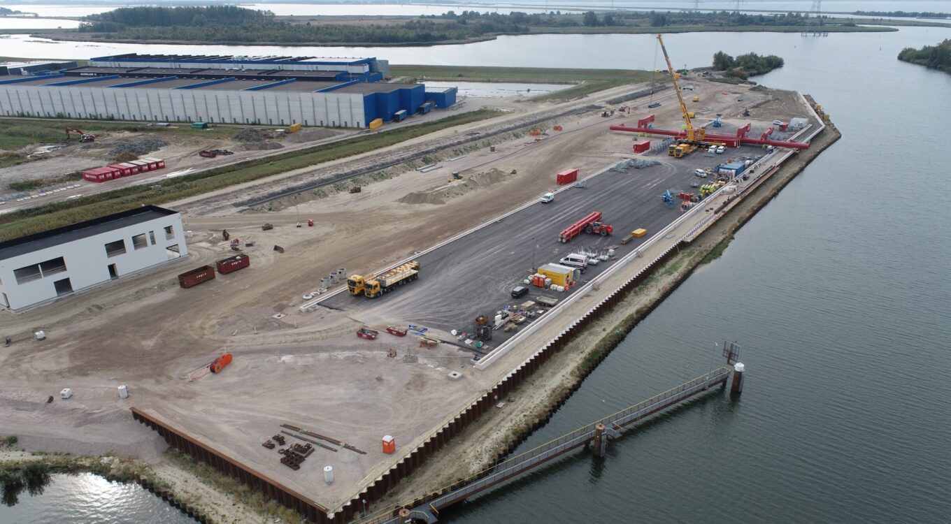 Het werk vindt plaats op de grens van land en water, met veel logistieke uitdagingen. Zo realiseerden we een betonnen overkluizing over een bestaande leidingstraat met een hogedrukgasleiding en persriool. Met behulp van een Quattro Piler drukten we twee damwandschermen van bijna 50 meter lang de grond in, onder toezicht van onder andere de Gasunie. Daarna bouwden we hierop een betonnen constructie zodat zwaar transport veilig kan passeren. Ook zijn in het Zoommeer drie eilanden aangelegd in het kader van KRW-maatregelen, waarbij rietwortels zijn getransplanteerd. Ondertussen werken we aan de definitieve kade, de kraanbaan van circa 550 meter en een betonnen deksloof van 525 meter. Het project vraagt om goede planning, samenwerking met onderaannemers en veel afstemming, maar dankzij de inzet van alle collega’s verloopt het werk volgens planning.