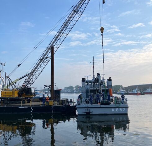 Tijdens dit onderzoek werden vier zeemijnen aangetroffen – een vondst die zelfs het nieuws haalde. Samen met gespecialiseerde partijen hebben wij geassisteerd bij het veilig ruimen van deze explosieven. Na het vrijgeven van het gebied kon de daadwerkelijke realisatie van de kade van start gaan.